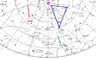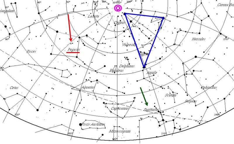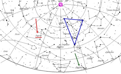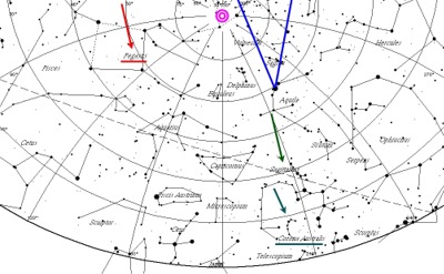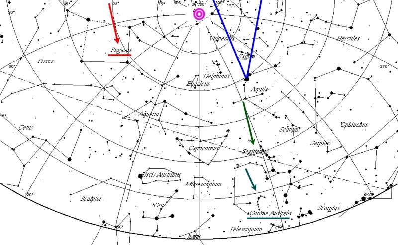 | Man erkennt: Je weiter südlich der Beobachtungsort liegt, desto mehr wandert das Sternbild Pegasus zum Zenit (ebenso auch das Sommerdreieck) I: Vom Sternbild Schütze sind nur wenige Sterne oberhalb des Horizonts. II: Das Sternbild Schütze (Sagitarius) ist nur zur Hälfte zu sehen. III) Das Sommerdreieck ist nicht mehr ganz zu sehen, dafür das komplette Sternbild Schütze. Unterhalb des Schützen sieht man sogar die Südliche Krone (Corona australis) (Durch Anklicken eines Bildes erhalten Sie jeweils ein vergrößertes Bild) |