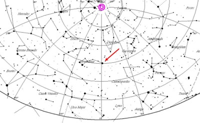 Den Polarstern findet man am Himmel leicht, wenn man die beiden hinteren Kastensterne des Großen Wagens als "Zeigesterne" verwendet: