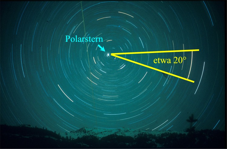 Man erkennt, dass der Polarstern nicht genau im Zentrum der Drehbewegung, also nicht genau am Himmelsnordpol steht. Die Sterne haben bei ihrer Drehbewegung einen Winkel von etwa 20° überstrichen. Eine einfache Dreisatzrechnung ergibt die Belichtungsdauer: