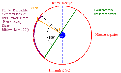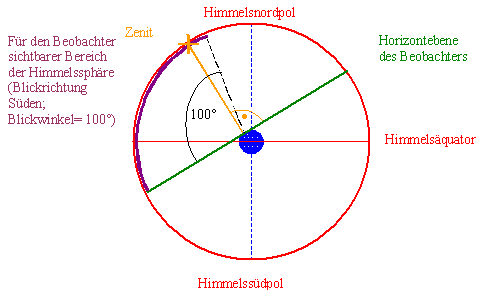 Aus der Skizze kann man entnehmen, dass für einen Beobachter auf der Nordhalbkugel der Erde auch bestimmte Bereiche des südlichen Sternhimmels sichtbar sind. In der obigen Skizze wird der Beobachter allerdings die Gebiete in der Nähe des Himmelssüdpols nicht sehen können.