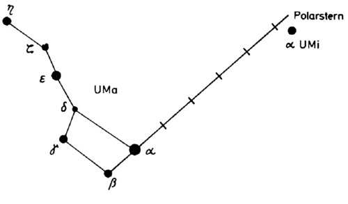 (Der "Große Wagen" ist Teil des Sternbilds "Großer Bär" (Ursa Maior, UMa); Der Polarstern gehört zum Sternbild "Kleiner Bär" (Ursa Minor, UMi))