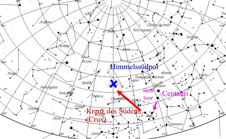 Zum Auffinden des Himmelssüdpols kann man das Sternbild "Kreuz des Südens", Crux) verwenden: Der längere Balken zeigt zum Himmelssüdpol. Allerdings ist das Kreuz des Südens ein recht kleines Sternbild und nicht besonders auffällig. Die Seefahrer und Entdeckungsreisenden der vergangenen Jahrhunderte verwendeten deshalb die hellsten Sterne des Sternbilds Centaurus als "Zeigesterne": Alpha und Beta Centauri zeigen genau auf das Kreuz des Südens. Übrigens: Der Stern Alpha Centauri (genau genommen ein Dreifachsternsystem) ist derjenige Fixstern, der der Erde am nächsten steht, er ist etwa 4 Lichtjahre entfernt.