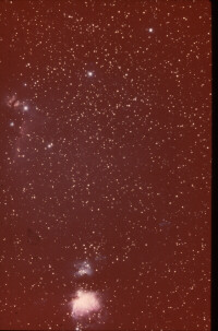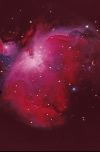 Wenden wir uns trotz dieses bevorstehenden Ereignisses kurz unseren Blick auf ein anderes Objekt im Sternbild Orion. Wir haben gesehen, daß ein Stern in einer Supernovaexplosion sterben kann. Doch werden Sterne auch geboren? Ja, eine solche Sternengeburtsstätte befindet sich ebenfalls im Sternbild Orion. Im Schwerpunkt des unteren Trapezes ist mit bloßem Auge eine Ansammlung von kleinen Lichtpunkten zu erkennen. Erst im Fernrohr, z. B. auf einer Sternwarte, erkennt man nicht
