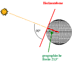 Übrigens: Je weiter man sich im Norden befindet, um so niedriger steht am Winteranfang die Sonne. Begibt man sich, ausgehend von 49° nördlicher Breite um weitere 17,5° nach Norden, so steigt am Mittag die Sonne überhaupt nicht mehr über den Horizont: Man befindet sich dann bei 66,5° nördlicher Breite, am nördlichen Polarkreis.
