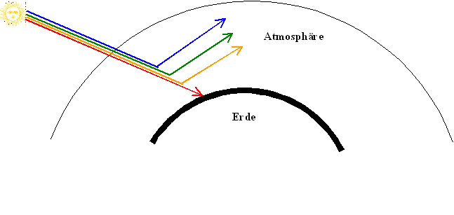 In der Reihenfolge blau - grün - gelb -rot wird die Lichtstreuung schwächer (Rayleigh-Streuung). Blaues Licht wird also am besten gestreut, rotes Licht viel weniger: