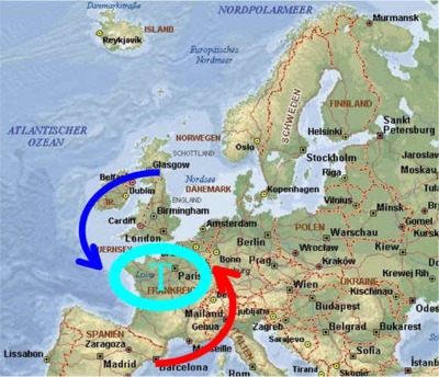 Auf der Vorderseite eines Tiefdruckgebiets wird deshalb oft warme Luft aus dem Süden herangeführt. Dadurch kommt es in vielen Fällen zur Ausbildung einer Warmfront.