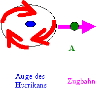 Spiralbahnen in des Tiefdruckgebiet hinein. Wenn ein Hurrikan über einen Punkt A hinwegzieht, trifft zuerst die Vorderseite mit hohen Windgeschwindigkeiten ein. Danach kommt das Auge des Hurrikans mit trügerischer Windstille. Danach folgt die Rückseite mit wiederum hohen Windgeschwindigkeiten. |